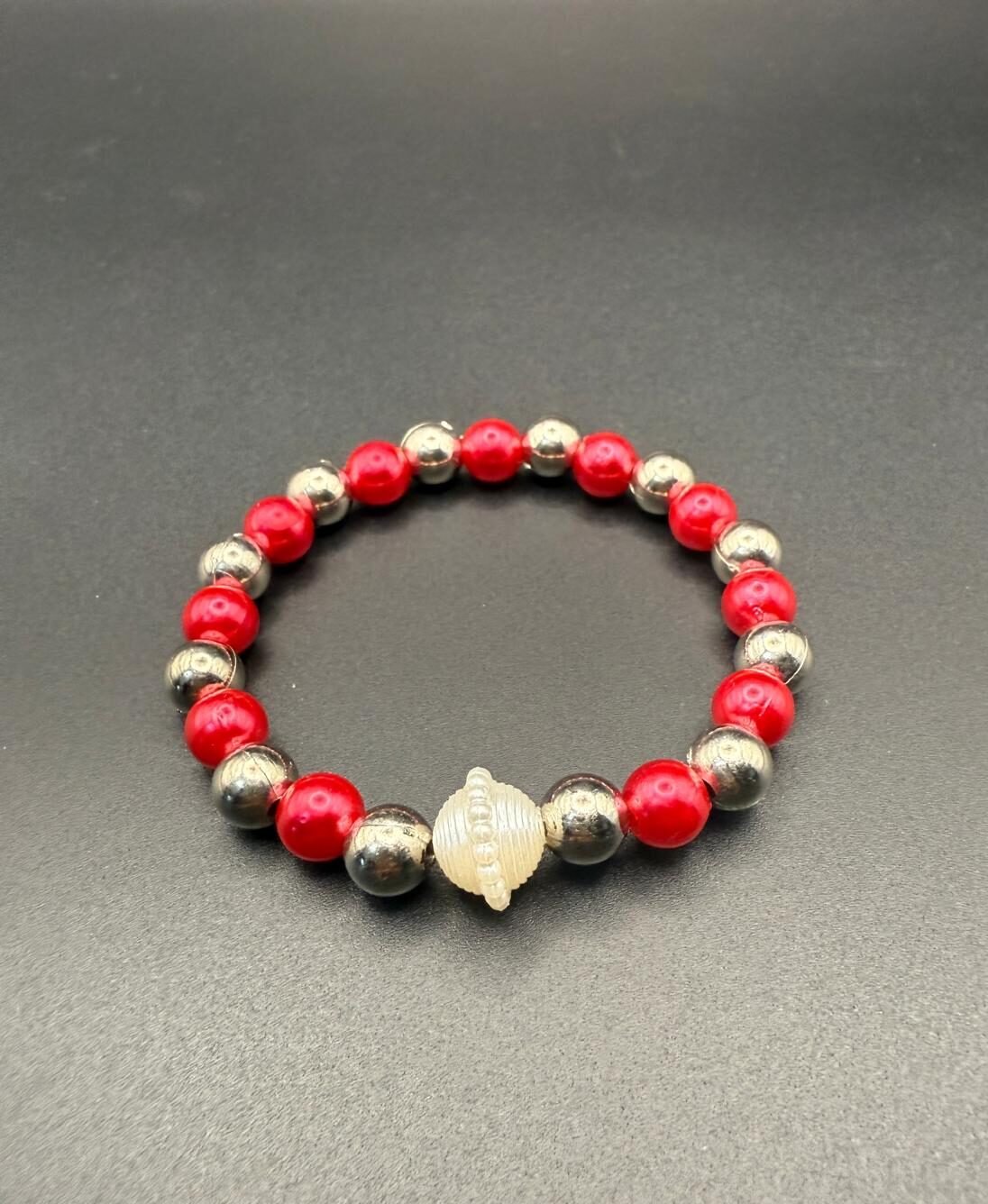This red and silver faux bead bracelet is beautifully finished with a luminous white pearl centerpiece—perfect for adding a touch of charm and shine to any look.