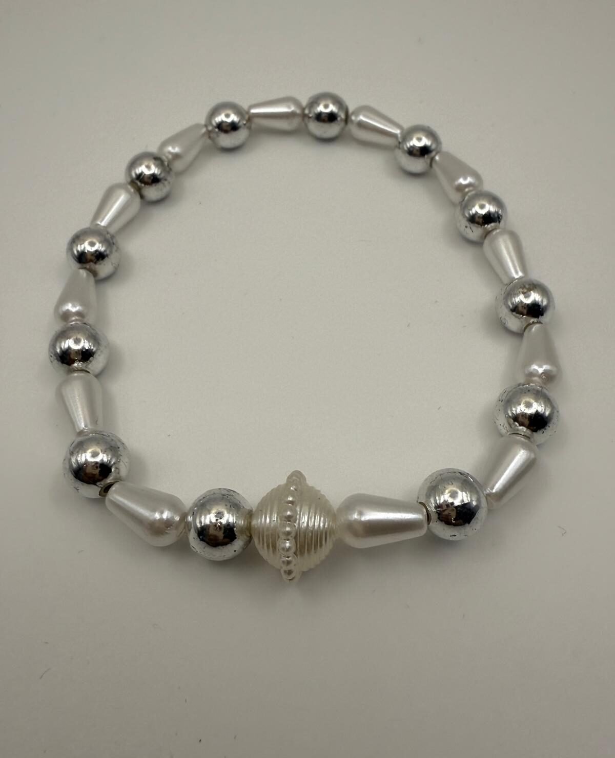 This silver faux pearl and white teardrop bracelet adds a soft, sophisticated touch to any outfit—perfect for everyday elegance or special moments.