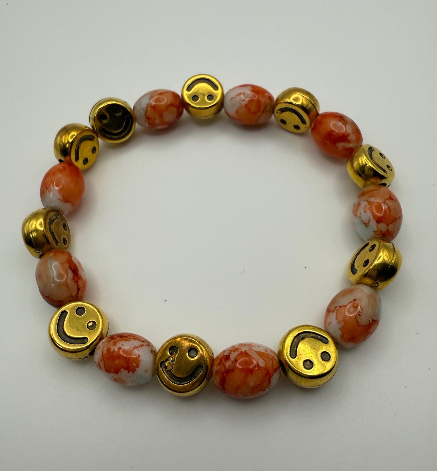Autumn tones with a golden smile 🍂🧡 Marbled orange beads paired with gold smiley charms for feel-good style.
