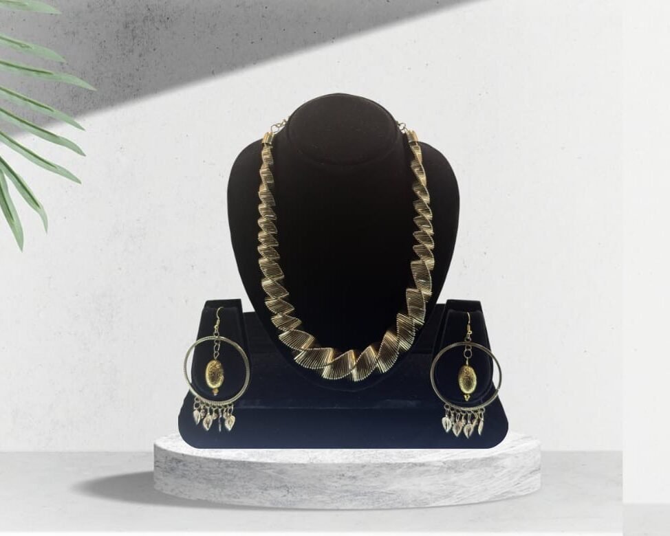 An elegant gold-tone necklace featuring a layered, textured design paired with matching hoop earrings adorned with delicate charms. This coordinated set blends modern sophistication for elevating both party and evening looks.