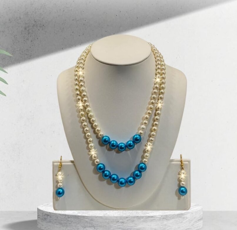 A 2 lined aqua marine and cream faux pearl 22 inches graduated necklace with long pearl drop earrings set for all parties & events.