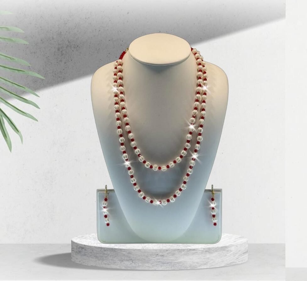 This 21 inch two lined faux pearl beads and red crystal necklace set will adore all business and party events.