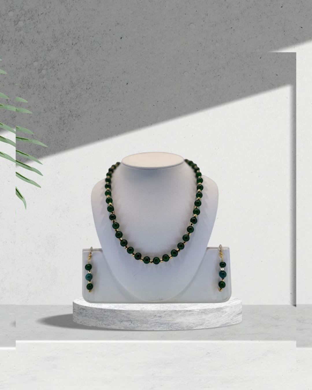 Fresh, elegant deep green beaded necklace with matching drop earrings, accented with gold for a look that pops beautifully day or night.