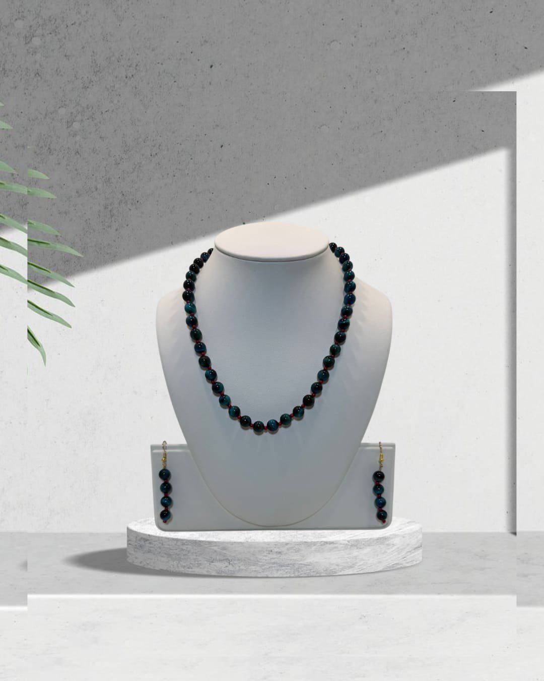 Elegant handmade beaded necklace and earring set featuring deep teal stones with rich red accents — a timeless piece that adds effortless sophistication to any outfit.