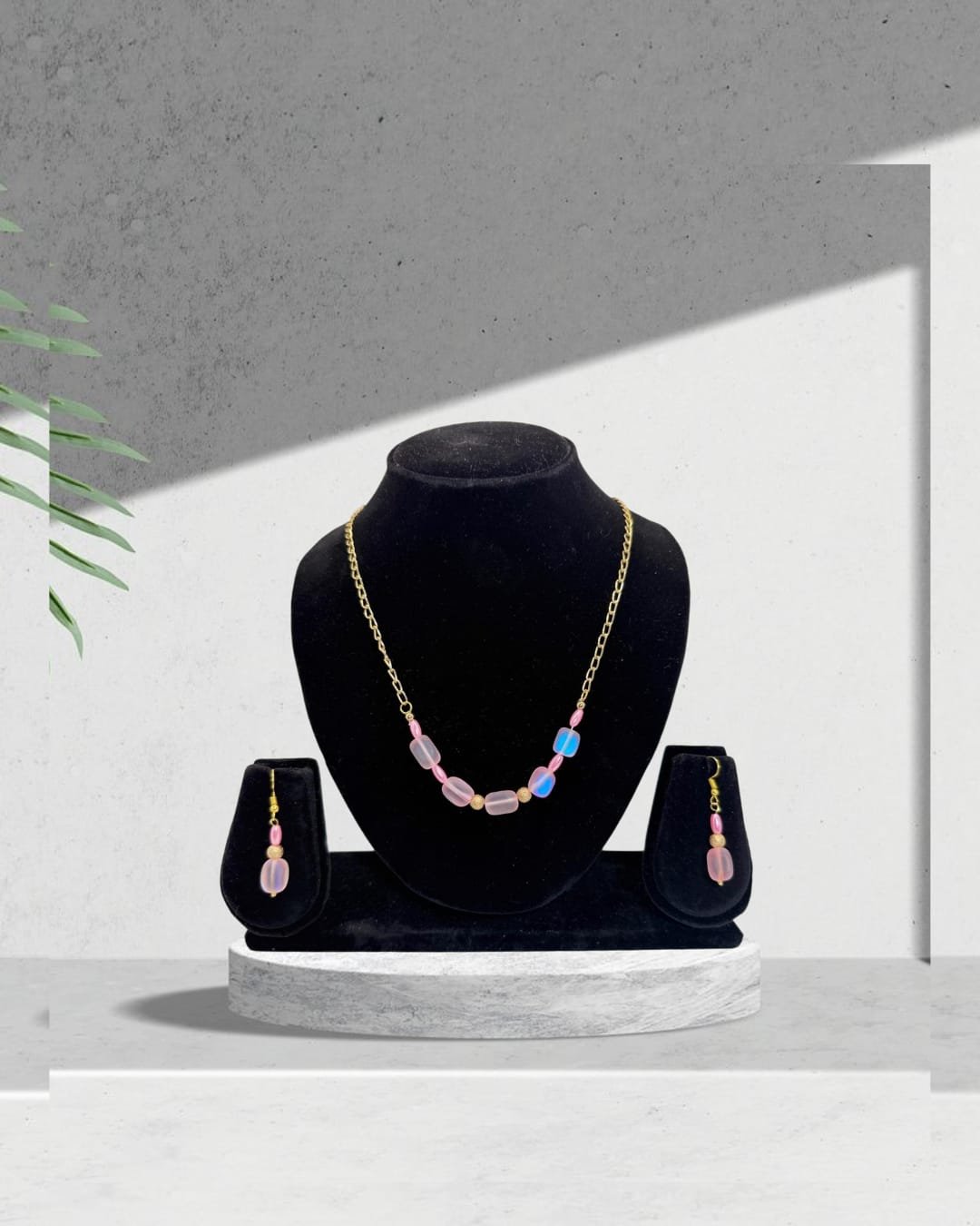 This handcrafted jewellery set features soft pink and iridescent beads paired with a gold-tone chain—perfect for adding cham and colour to any outfit