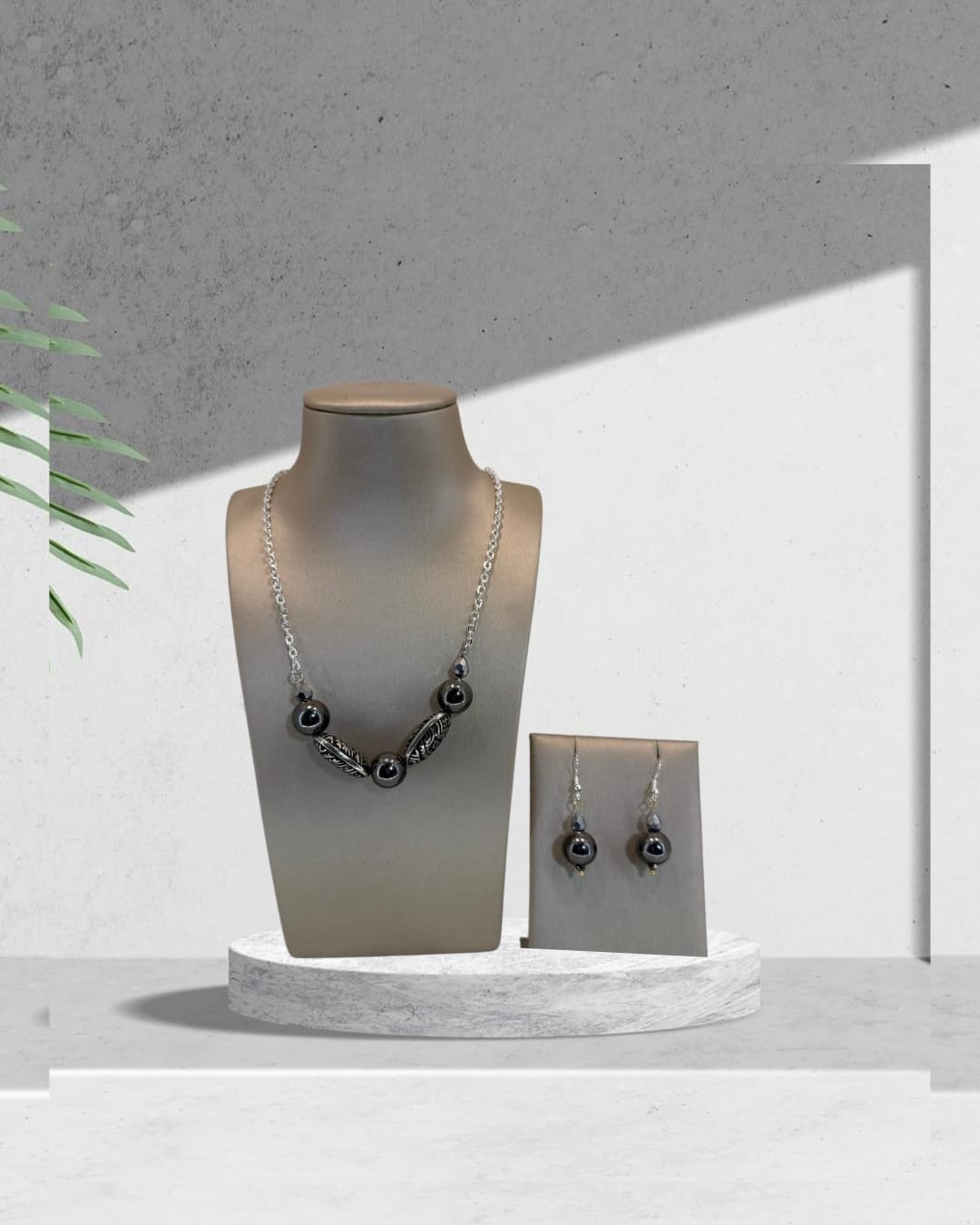 Elegant and sleek silver-tone necklace paired with matching drop earrings, finished with glossy antique beads for a modern look. Perfect for day-to-night styling
