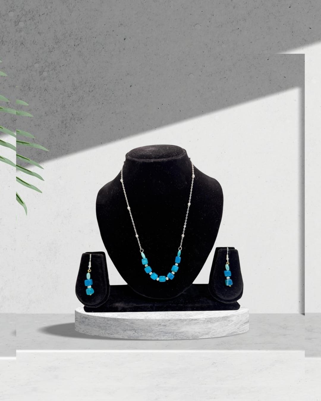 Handcrafted silver-tone necklace and matching earrings, finished with vibrant ocean blue beads for an easy, vibrant statement.